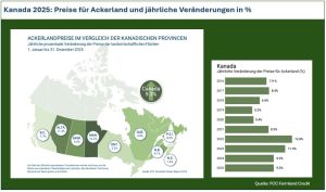 Kanadisches Agrarland behauptet weiterhin seine Position als stabile, langfristige Anlageklasse, gestützt durch starke Fundamentaldaten wie ein begrenztes Angebot an landwirtschaftlich nutzbaren Flächen, die weltweite Nachfrage nach Lebensmitteln sowie die robuste Finanzlagen der landwirtschaftlichen Betriebe. Aktuelle Daten der Farm Credit Canada (FCC) zeigen jedoch eine zunehmende Regionalisierung der Marktentwicklung, mit deutlichen Unterschieden zwischen den Prärieprovinzen und Provinzen wie Ontario.