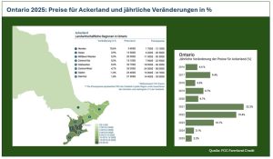 Selbst in einem Umfeld mit stagnierendem Wachstum bestätigen die Daten der FCC, dass diese Region strukturell durch Knappheit und Produktivität gestützt bleibt. Dies macht den Südwesten von Ontario zu einem wichtigen Markt für landwirtschaftliche Flächen mit institutioneller Qualität.
