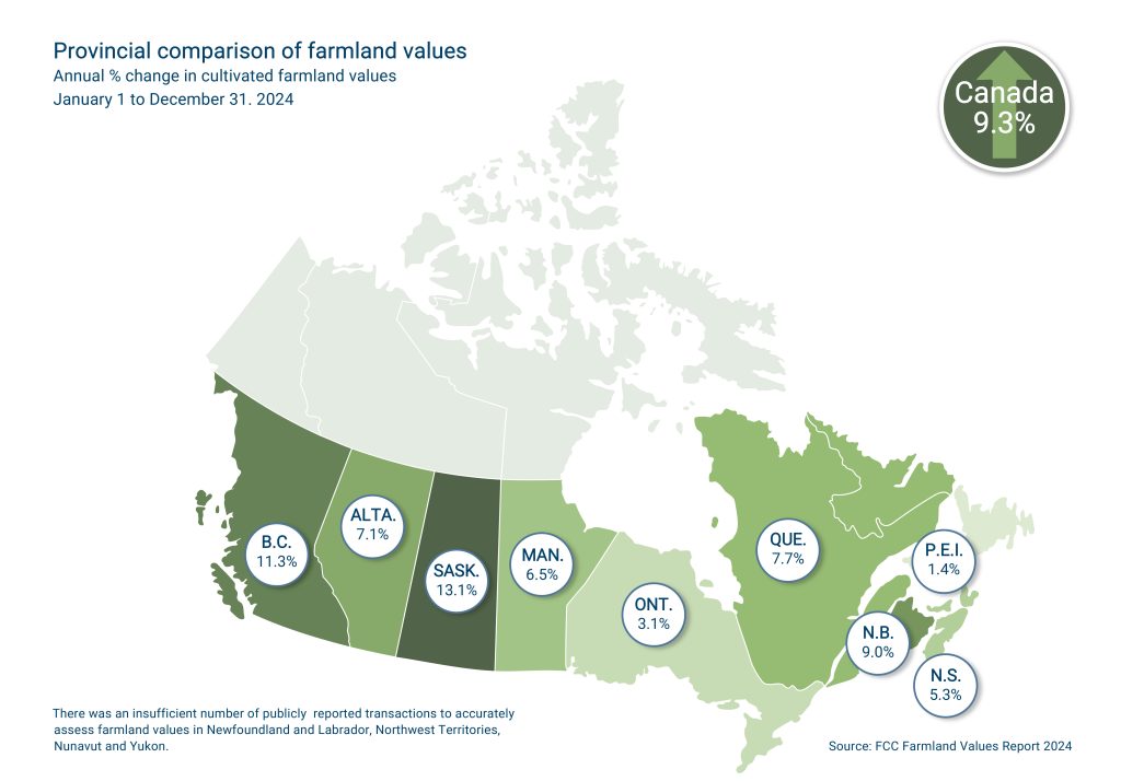 The average appreciation for farmland in 2024 was 9.3%, lower than the increase of 11,5% reported for 2023. The highest increases were reported for Saskatchewan 13,1%, followed by British Columbia at 11,3% and New Brunswick at 9,0 %.